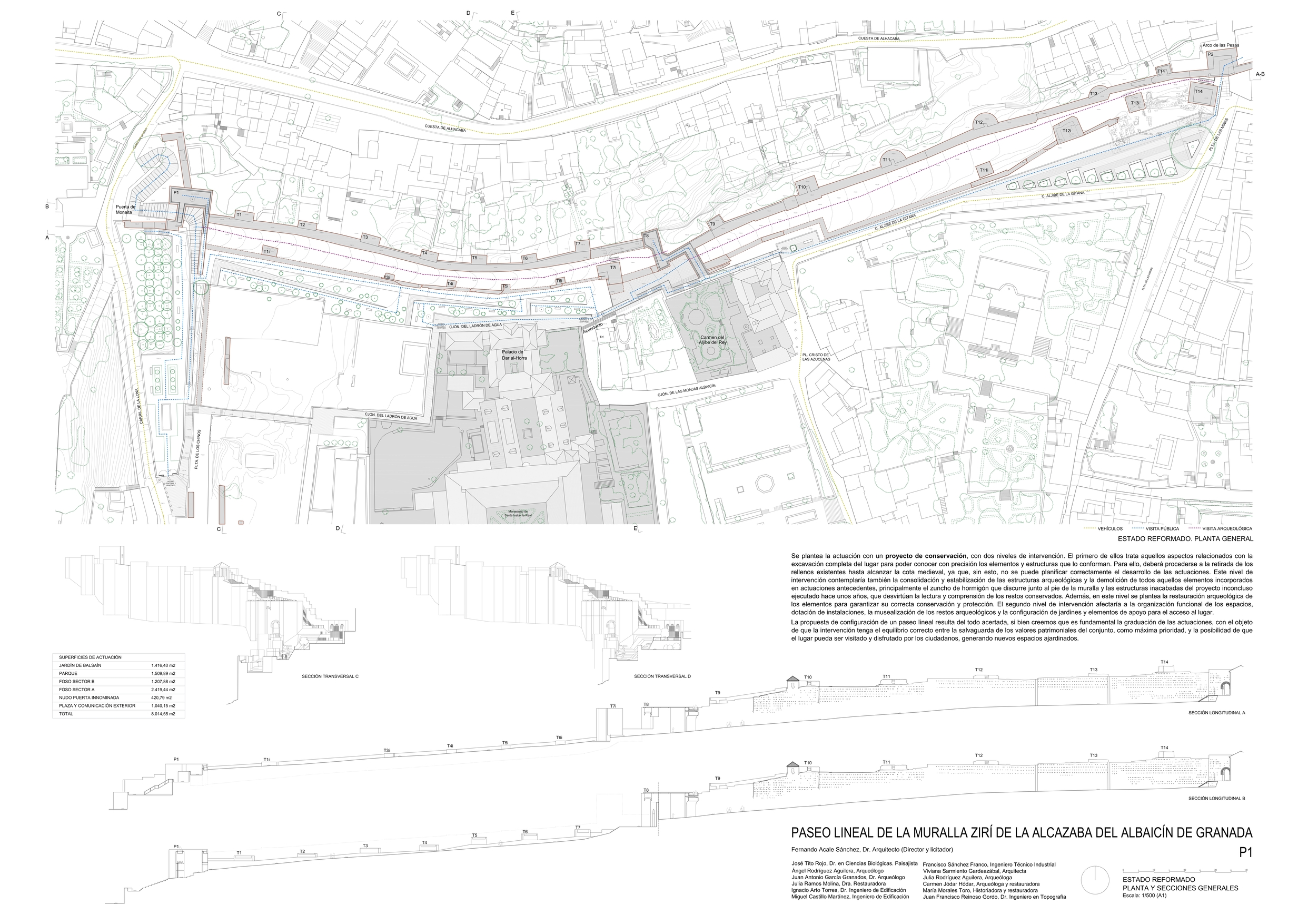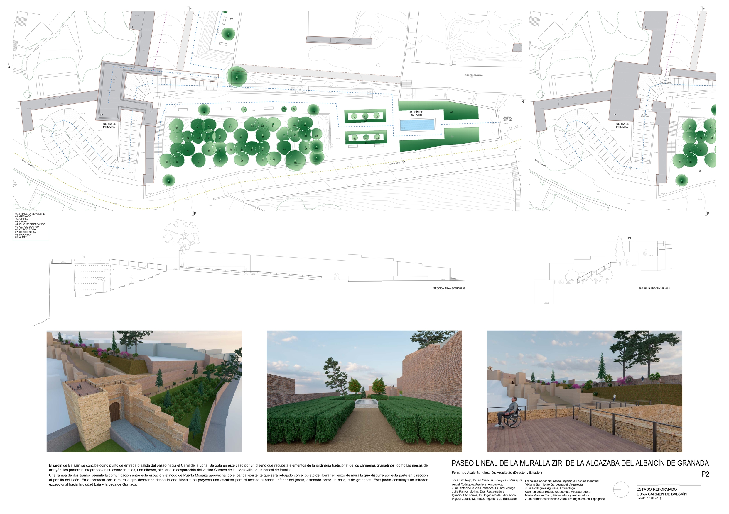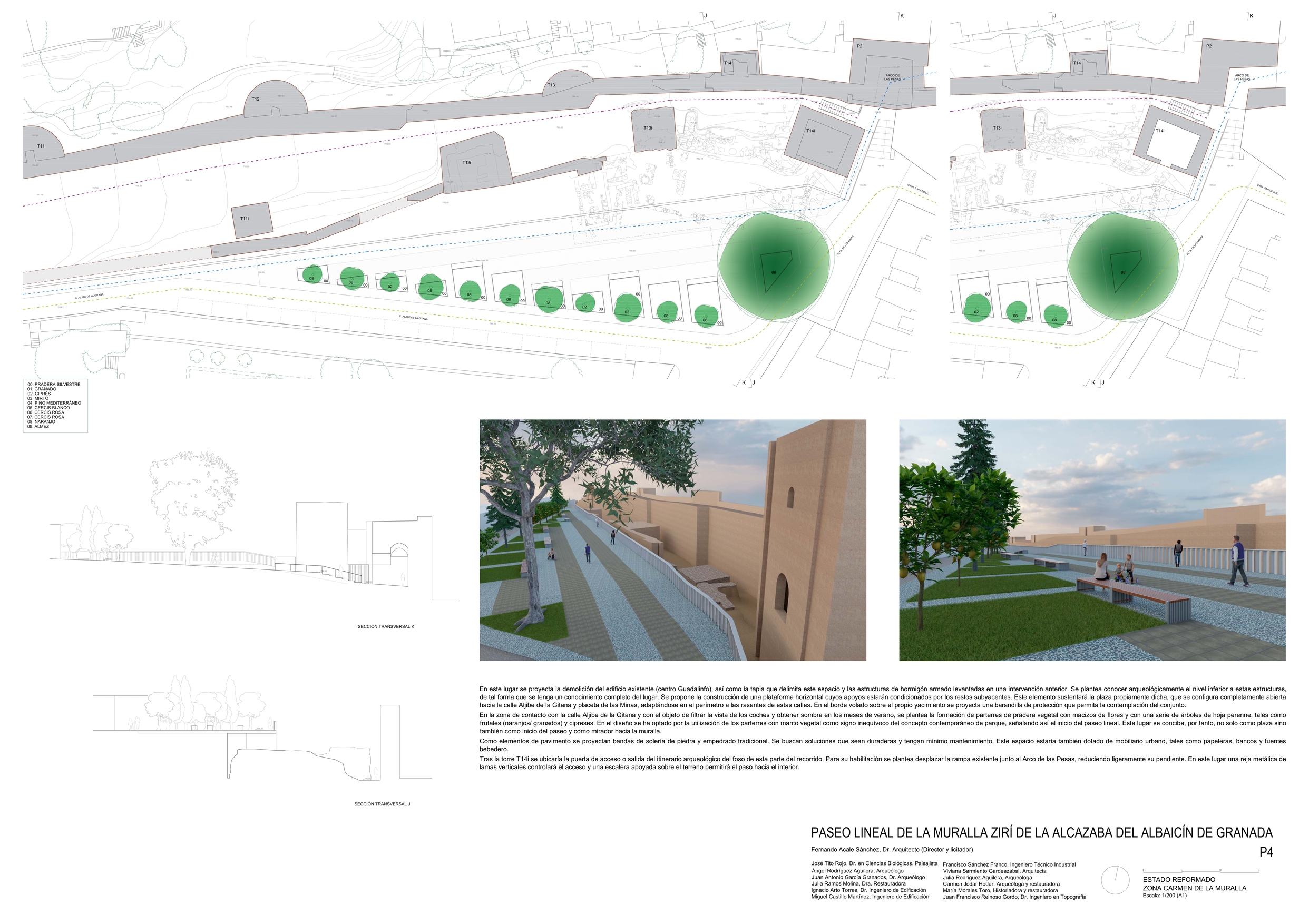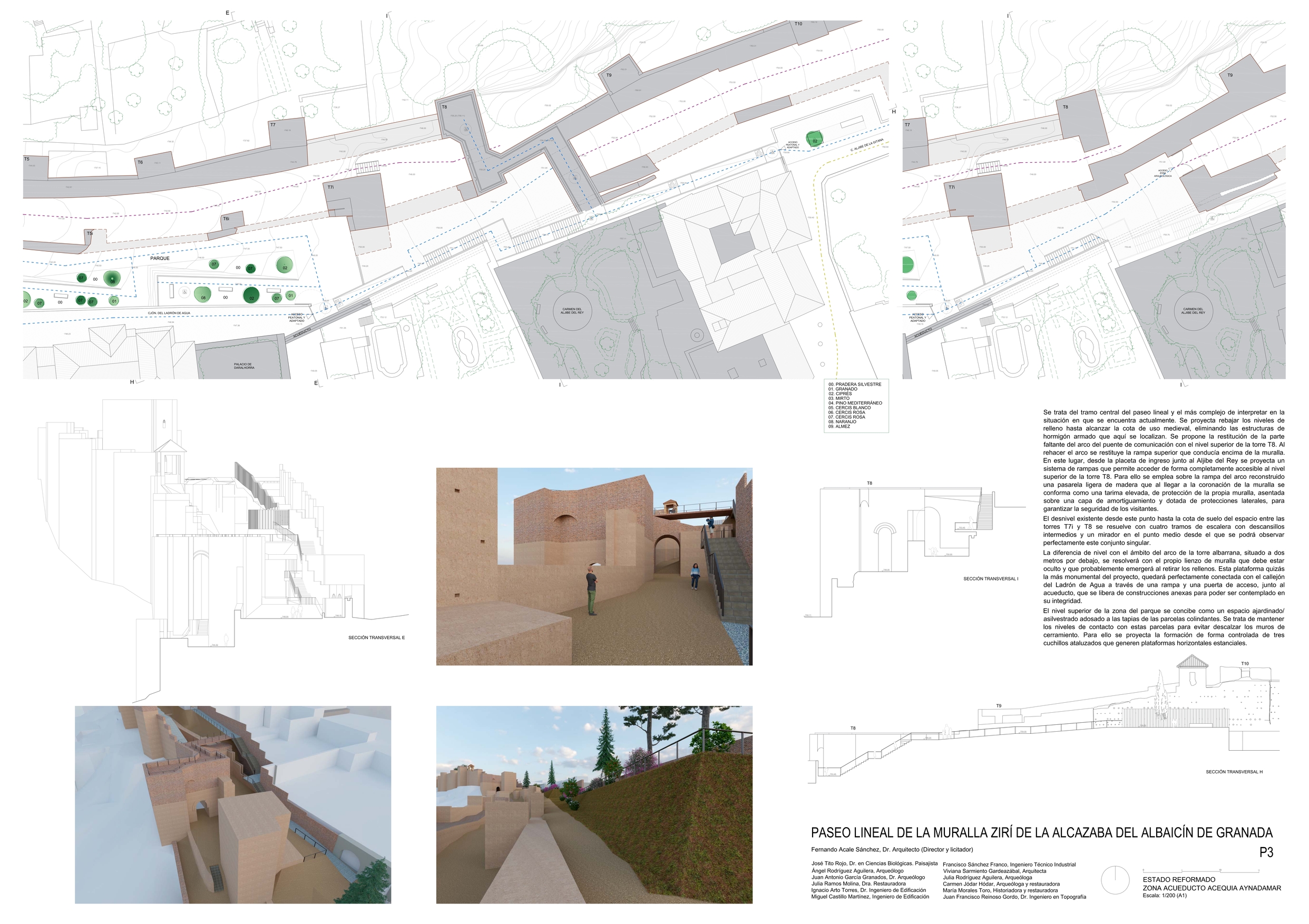 El objeto de la licitación es el diseño de un paseo lineal que discurra desde la placeta de las Minas hasta el Carril de la Lona, paralelo a la muralla, planteándose, además, la posibilidad de crear una nueva conexión en un punto intermedio de la cuesta de la Alhacaba, a través del arco existente, denominado en la documentación facilitada por el Excelentísimo Ayuntamiento como “puerta de la Caba o de Alhacaba”. La premisa fundamental aplicada en el diseño que proponemos es el máximo respeto a los valores patrimoniales del conjunto, tanto materiales (estructuras defensivas, acequia de Aynadamar, acueducto o Arco de las Monjas, etc.), como inmateriales, como el valor paisajístico, histórico, arqueológico y urbano.