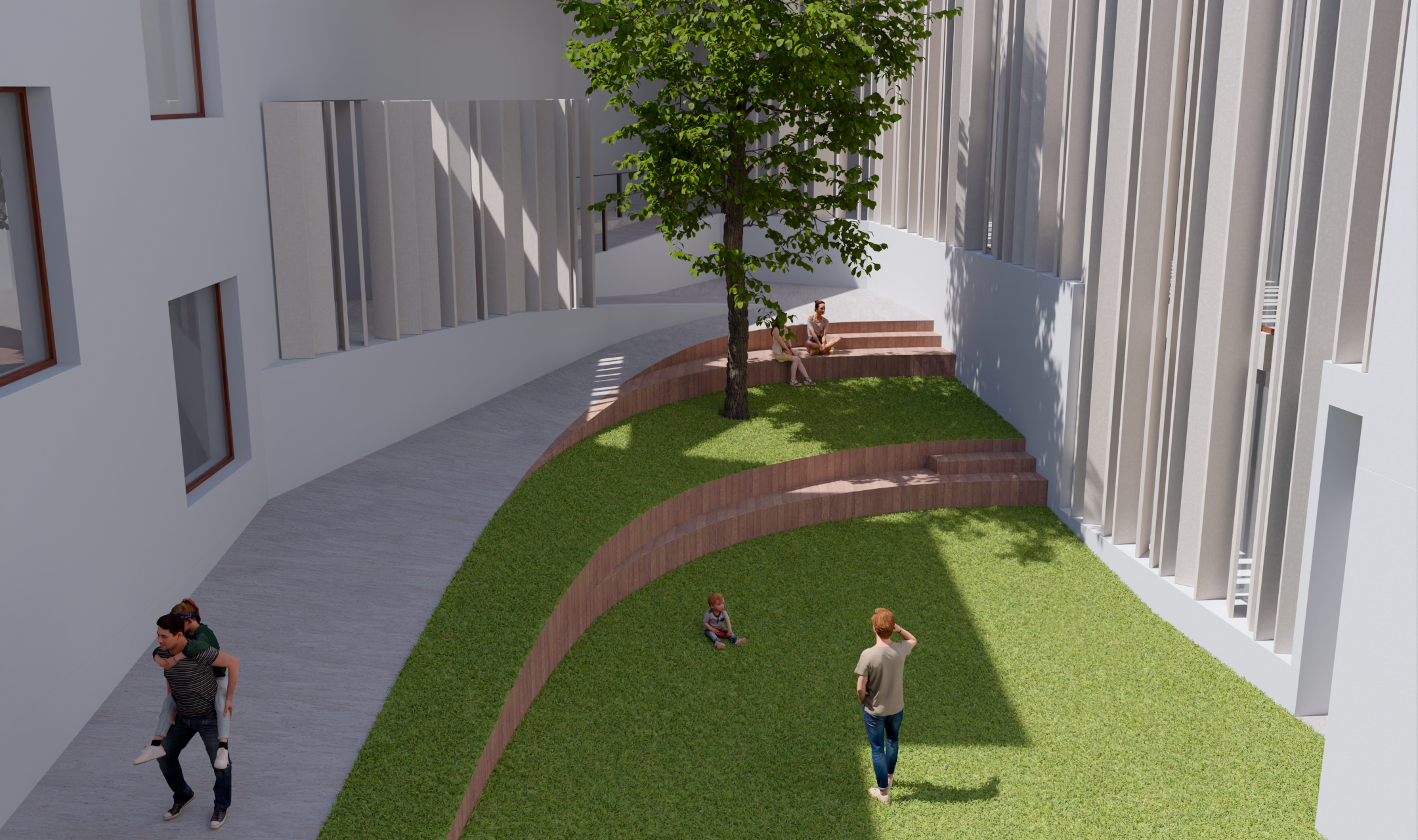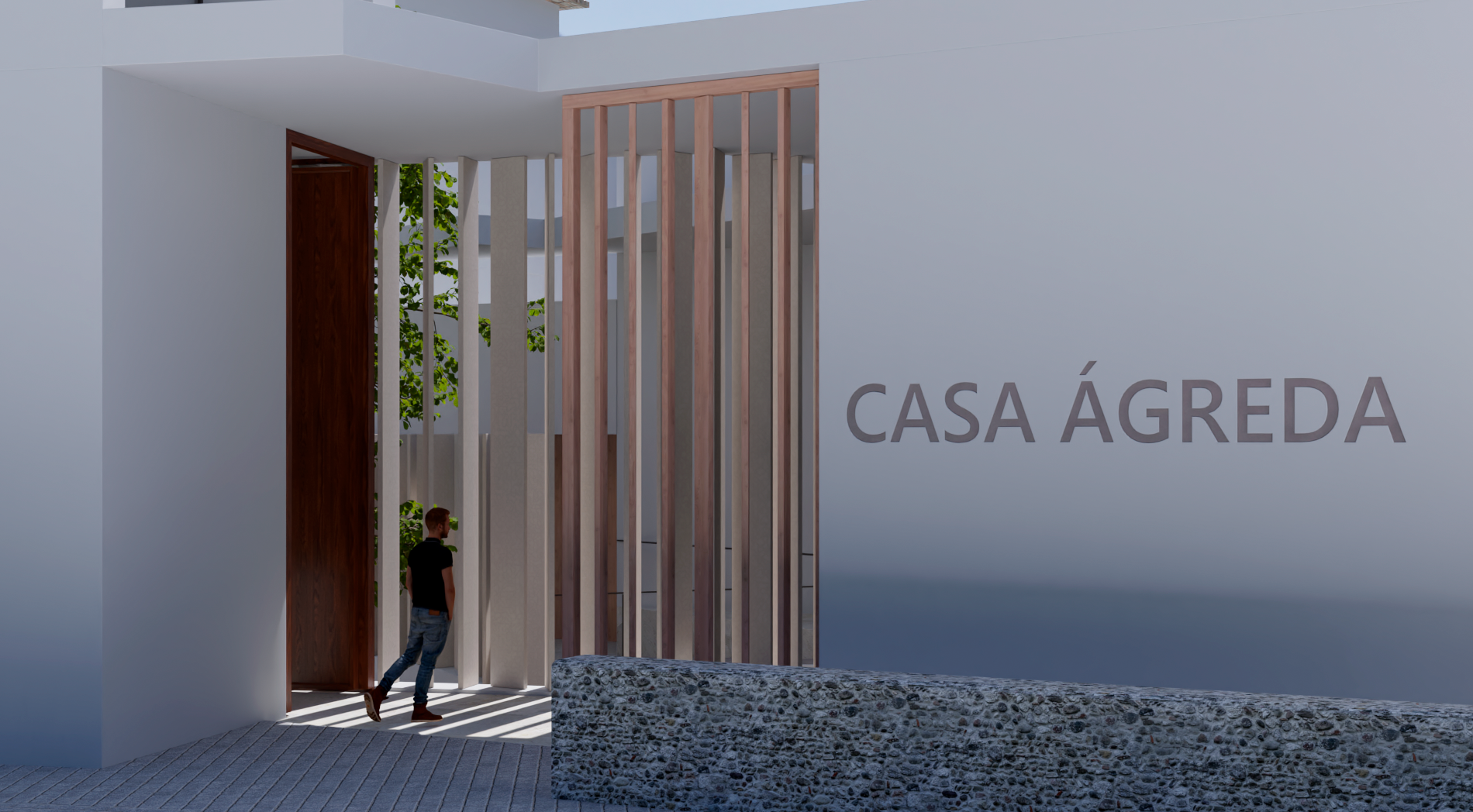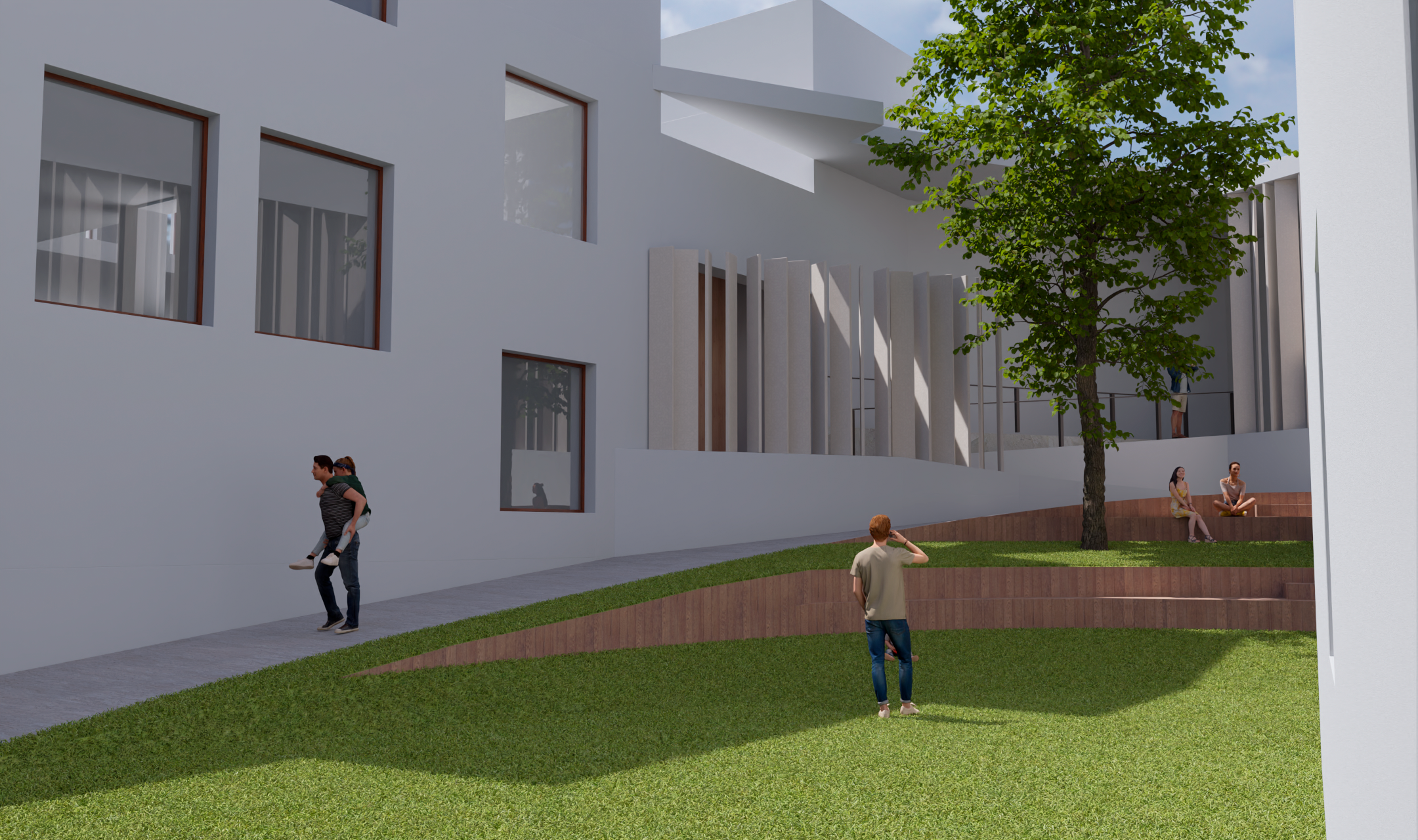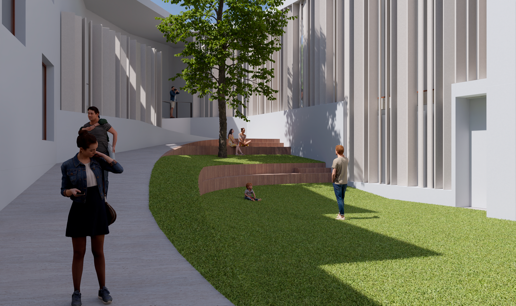Formalmente se plantea un edificio que resuelve los desniveles existentes entre las distintas edificaciones, garantizando la accesibilidad a todos los espacios. Es un edificio de carácter orgánico que se acomoda al espacio precedente, configurando una zona abierta y otra cerrada, de tal forma que se produce una imbricación continua entre el espacio del jardín o plaza central y las propias edificaciones que conforman la nueva Casa Ágreda. Una celosía de madera de lamas rectangulares verticales, orientables según las necesidades climatológicas, homogeniza el conjunto, ofreciendo una imagen cambiante y variable del edificio, en función del soleamiento. El antiguo jardín, presidido por el gran árbol de hoja caduca, se convierte en una plaza interior, que resuelve el desnivel existente mediante un diseño orgánico que crea unas suaves pendientes por donde es posible circular sin dificultad, generando a modo de un tapiz diferentes texturas de pavimento y vegetación. Este espacio tiene también una clara vocación estancial, donde se puede sentar el visitante a descansar o simplemente se puede disfrutar como un espacio de lectura, como una plaza más del barrio. En este lugar, en la planta inferior del nuevo edificio de recepción se proyecta una cafetería/ restaurante, que podrá también utilizar parte del espacio de esta nueva plaza. La disposición de los niveles que se forman y ordenan este espacio, ha sido concebida también como un graderío al aire libre donde poder presenciar actuaciones, generándose así un espacio versátil y polivalente.