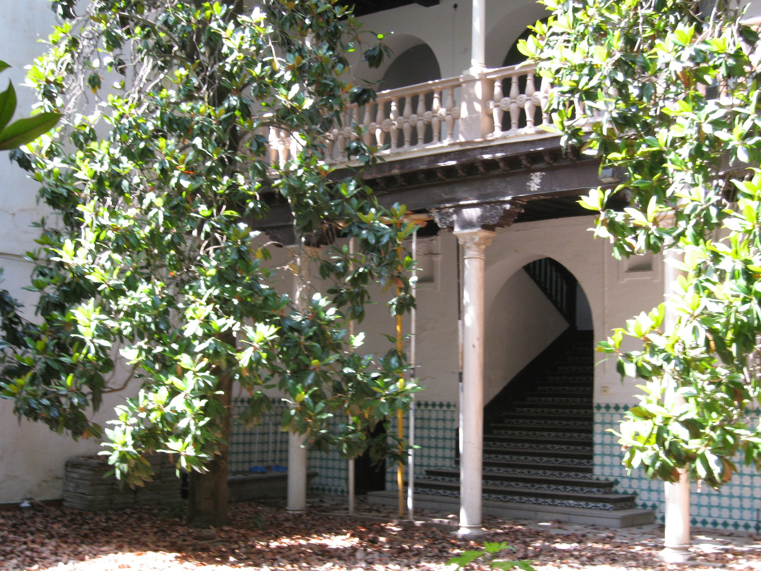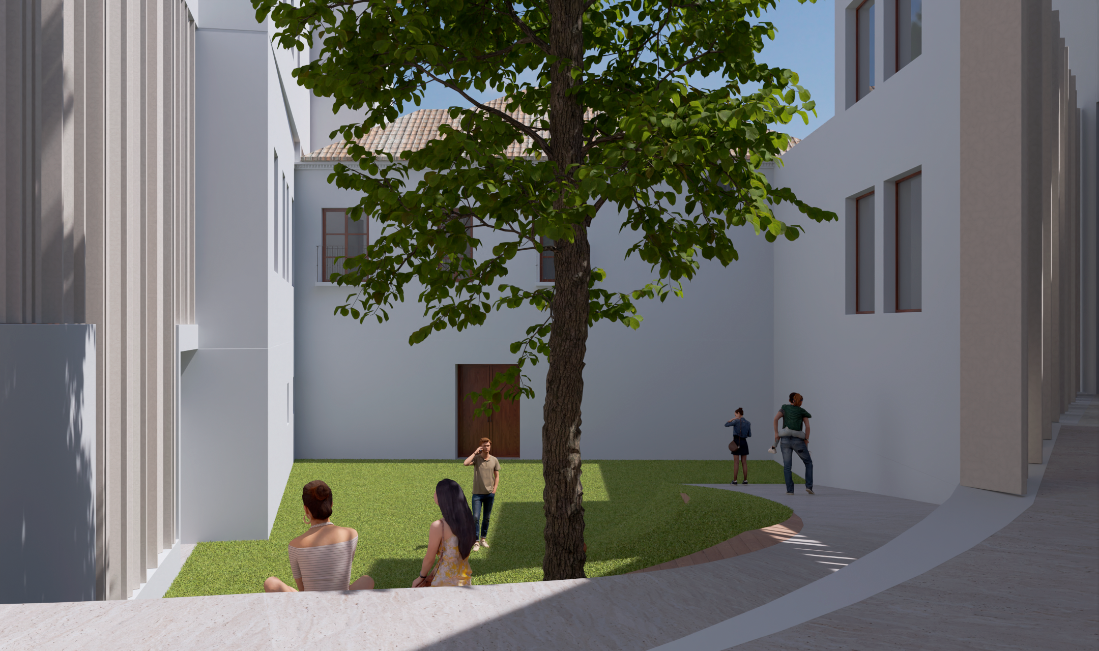 Respecto a la casa palacio (edificio A), se proyecta su conservación íntegra, realizando un cuidadoso ejercicio de restauración que ponga en valor los elementos tipológicos originales del edificio, como son el zaguán, el patio, las galerías, la escalera principal y las distintas salas y crujías del edificio. Igualmente se proyecta la recuperación y conservación de todos los elementos de interés histórico‐ artístico que contiene, tanto la portada monumental, como los alfarjes y armaduras, columnas, etc. Una decisión importante en el proyecto ha sido renunciar al zaguán del palacio como acceso principal. Entendemos que este es un lugar emblemático del edificio, que contiene además un importante valor simbólico en torno a la figura de San Juan de Dios y que, por tanto, debe ser un espacio de entrada limitado a ocasiones puntuales, quedando integrado en el conjunto de las salas del edificio como una sala expositiva más.
