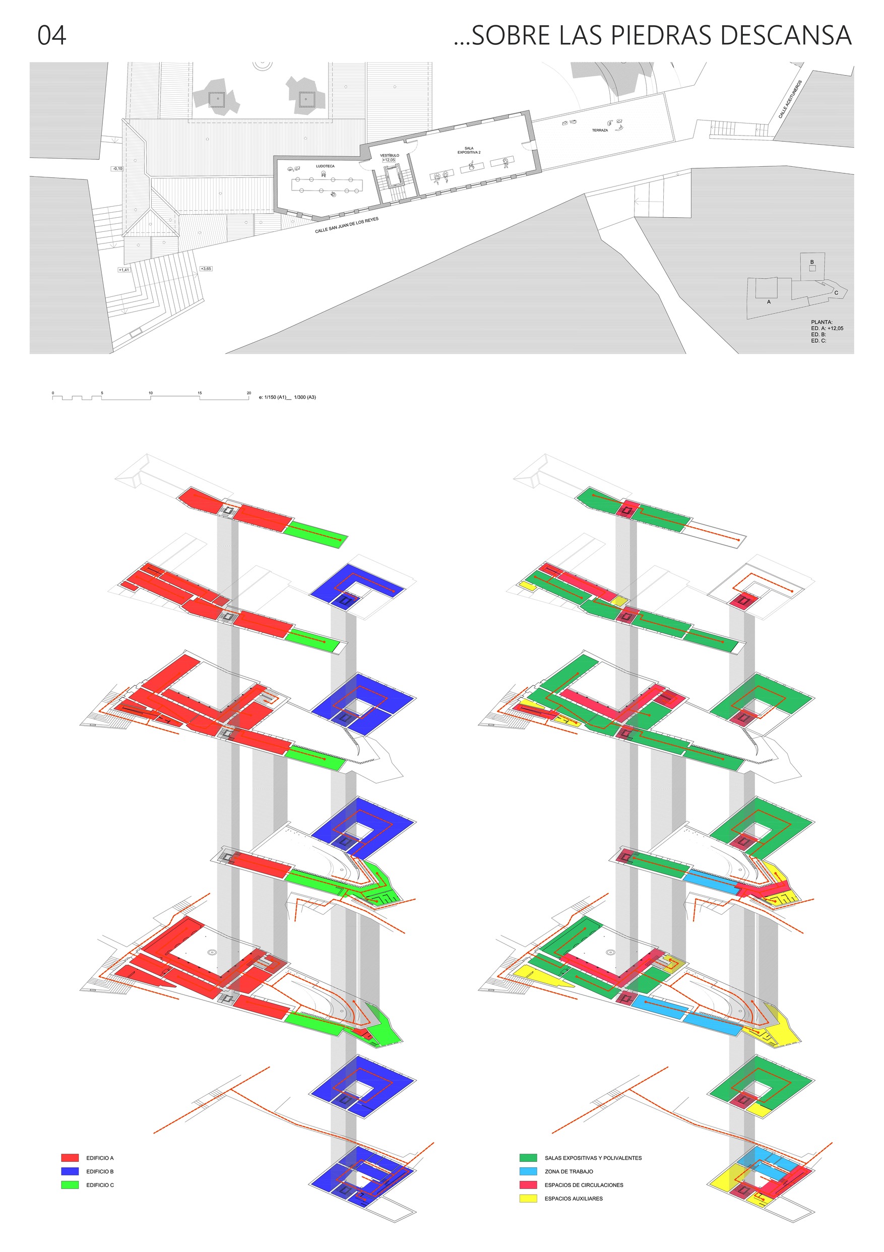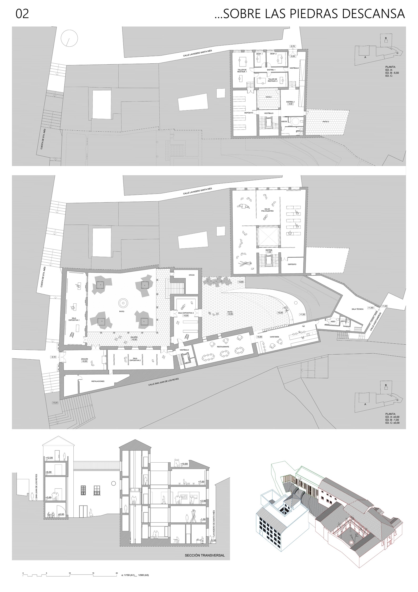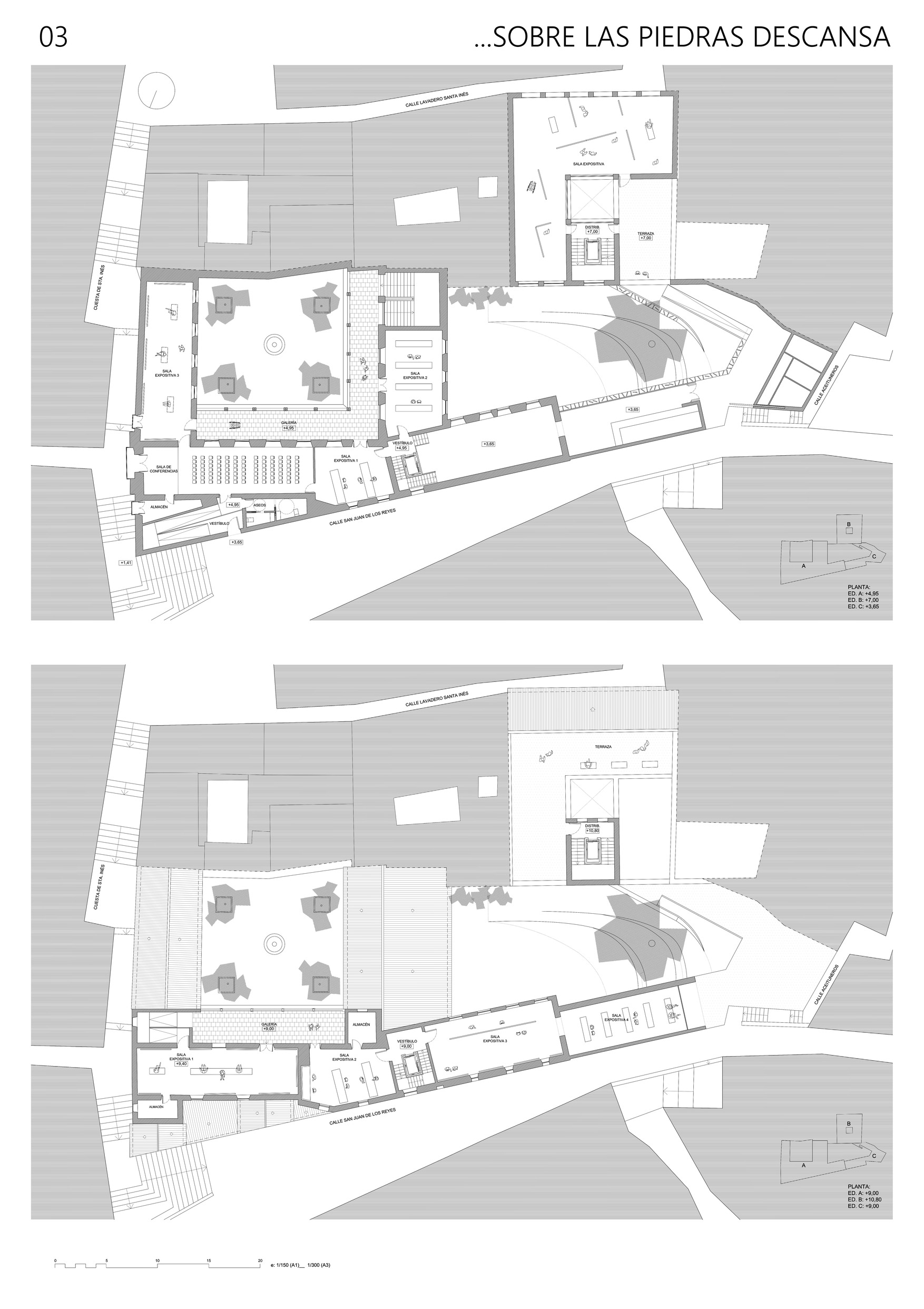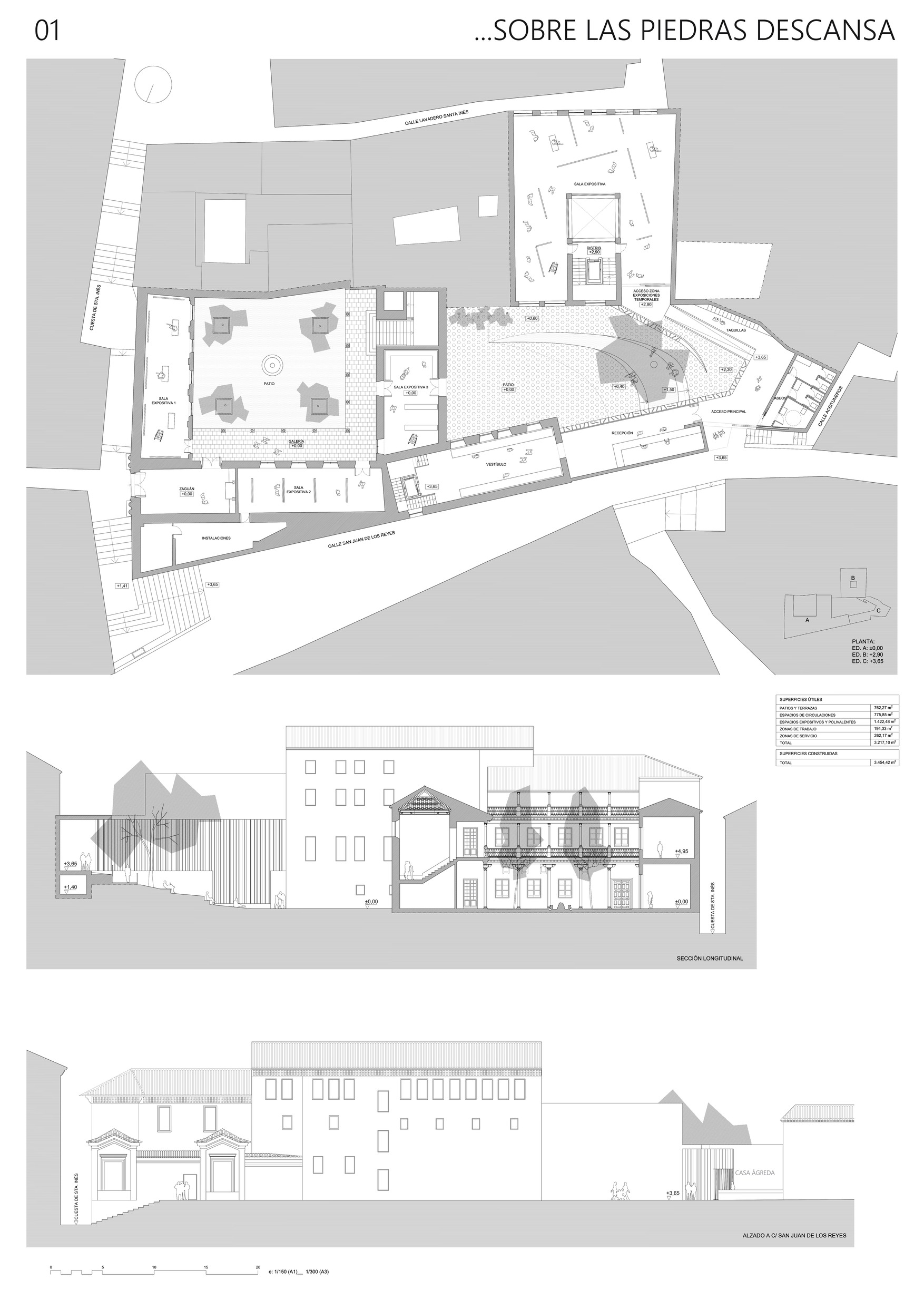 El proyecto reconoce todas estas cuestiones y precisamente incide especialmente en este lugar, ubicando en este punto el acceso a la Casa Ágreda como espacio cultural y expositivo. Entendemos que es un lugar con un alto potencial urbano ya que supone el cruce de dos calles del barrio con trazados y condiciones completamente diferentes. La calle Aceituneros y su continuación por la Cuesta del Granadillo hasta la placeta de Porras y Carvajales es una calle que, siguiendo la línea de máxima pendiente, une la parte intermedia del barrio con la Carrera del Darro. Se trata de calles estrechas, sinuosas y escalonadas y estrictamente peatonales, desde donde se obtienen interesantes e inesperadas vistas de la Alhambra. La calle San Juan de los Reyes, en cambio, sigue la curva de nivel de la ladera, sin apenas alteraciones en su pendiente, atraviesa el barrio desde plaza Nueva hasta la cuesta del Chapiz y es apta para la circulación